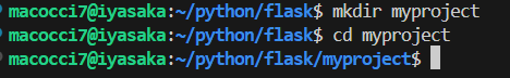 プロジェクトフォルダ「myproject」を作成し中に入ります。