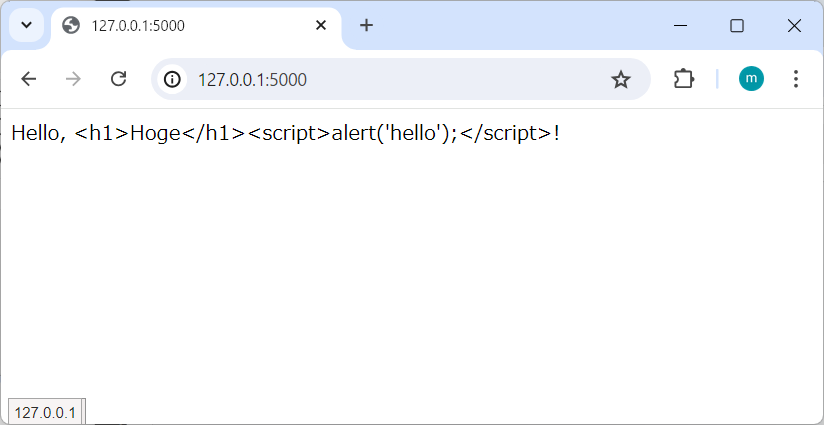 name = "<h1>Hoge</h1><script>alert('hello');</script>"