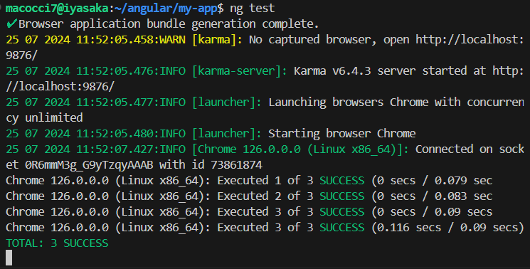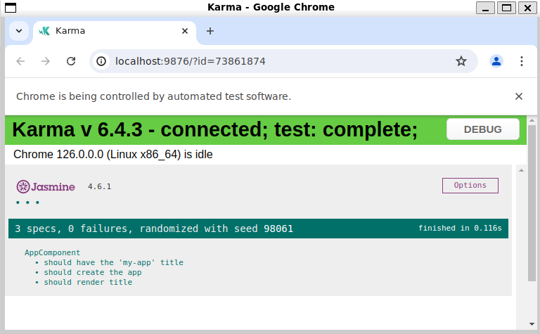 同時にUbuntu上でWEBブラウザが起動し、Karmaによるテスト結果が表示されます。