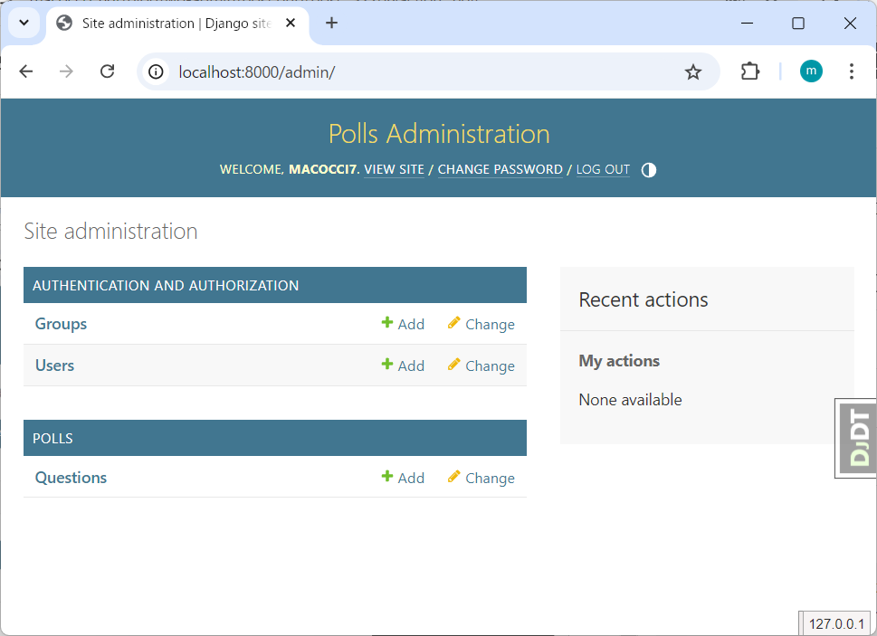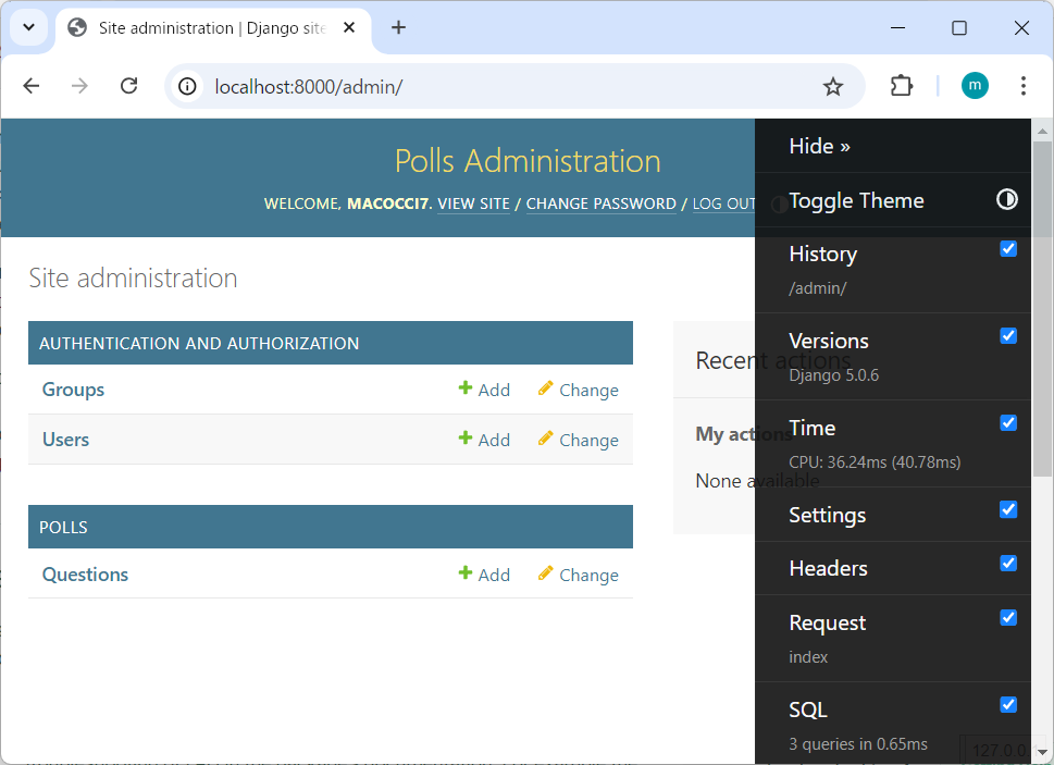 インストール後、投票アプリケーションを更新すると、ブラウザ ウィンドウの右側に DjDT の「ハンドル」が表示されるはずです。これをクリックしてデバッグ ツールバーを開き、各パネルのツールを使用します。パネルに表示される内容の詳細については、パネルのドキュメント ページを参照してください。