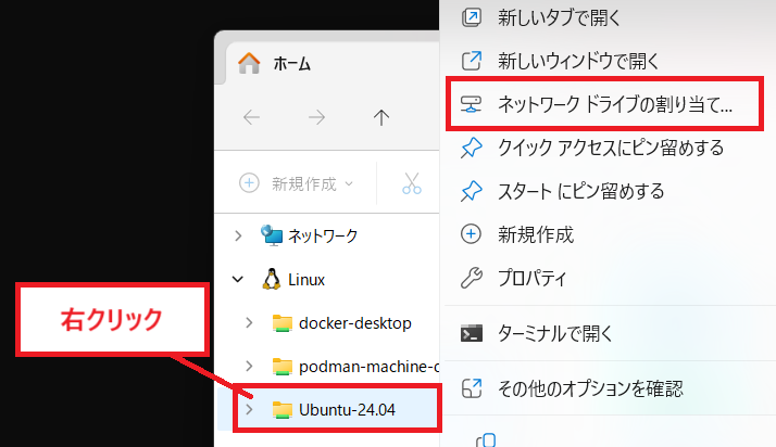 エクスプローラの「Linux」の中にある「Ubuntu-24.04」を右クリックして、「ネットワークドライブの割り当て」を選択。