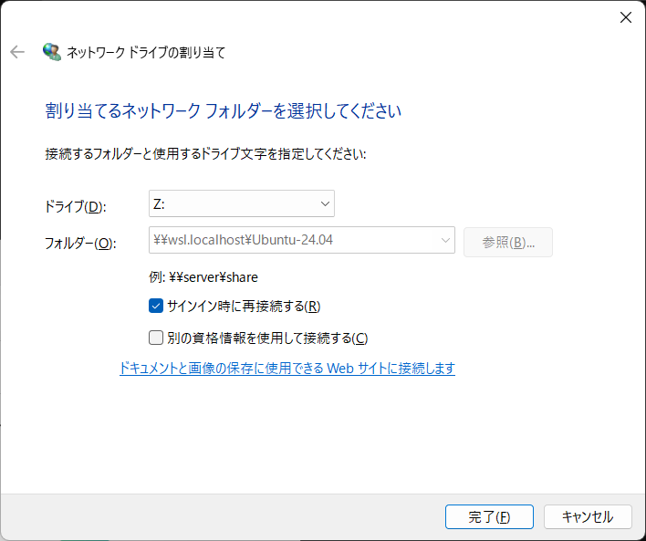 ドライブを指定して(ここでは Z )「完了」ボタン押下。