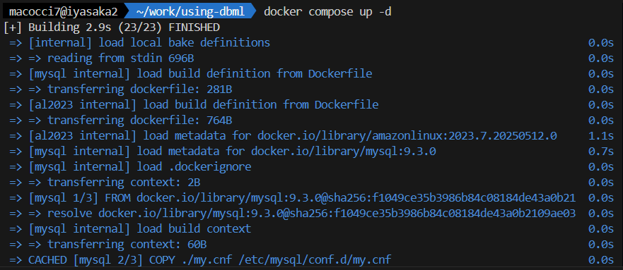 - 作業用コンテナ: Amazon Linux 2023, Node.js, DBML CLI
