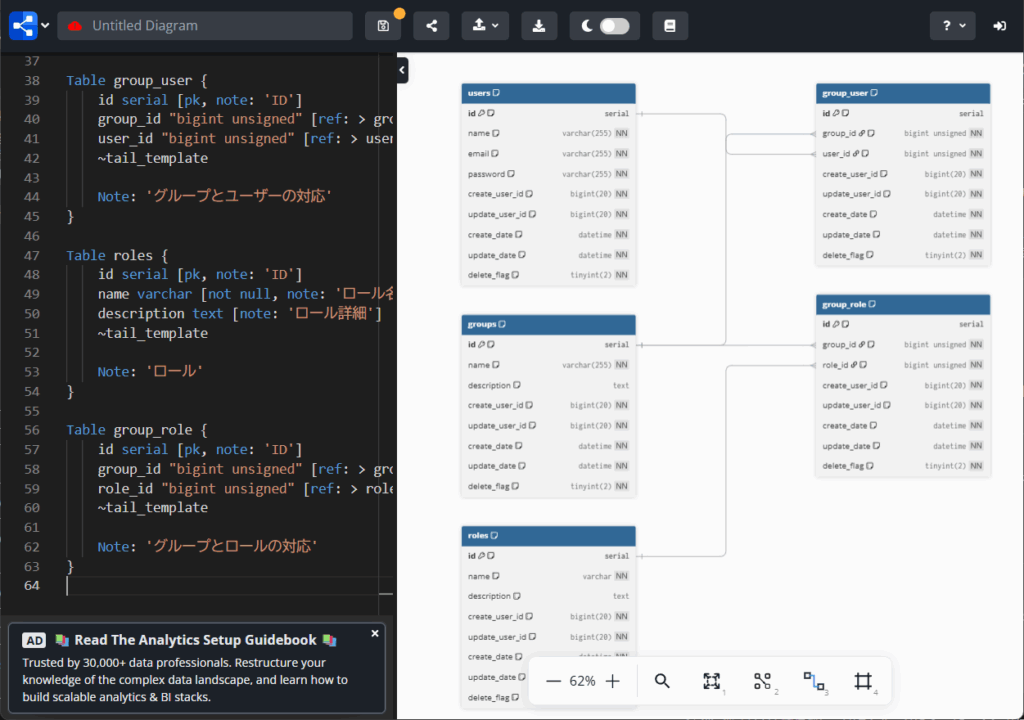 画面左側のエディターにDBMLを貼り付けると、右側にリアルタイムでER図が表示されます。