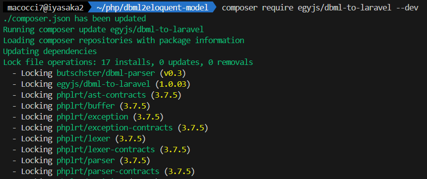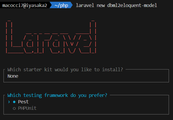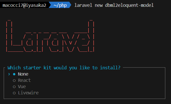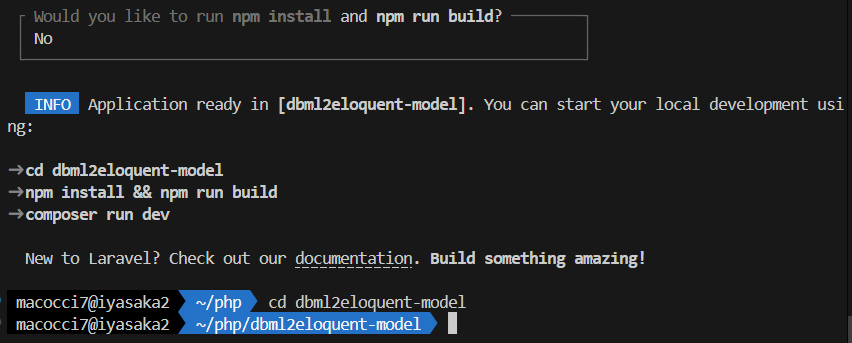 Laravel新規プロジェクト「dbml2eloquent-model」を作成します。