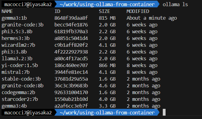 ホストOSのUbuntu側にストアされているLLMのリストが表示されました。