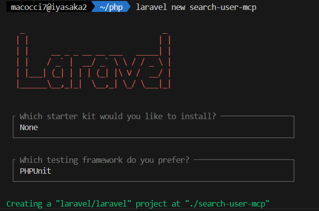Laravel新規プロジェクト「search-user-mcp」を作成します。