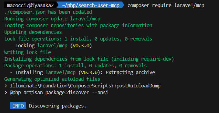 作成したLaravelプロジェクト「search-user-mcp」フォルダに入ってから