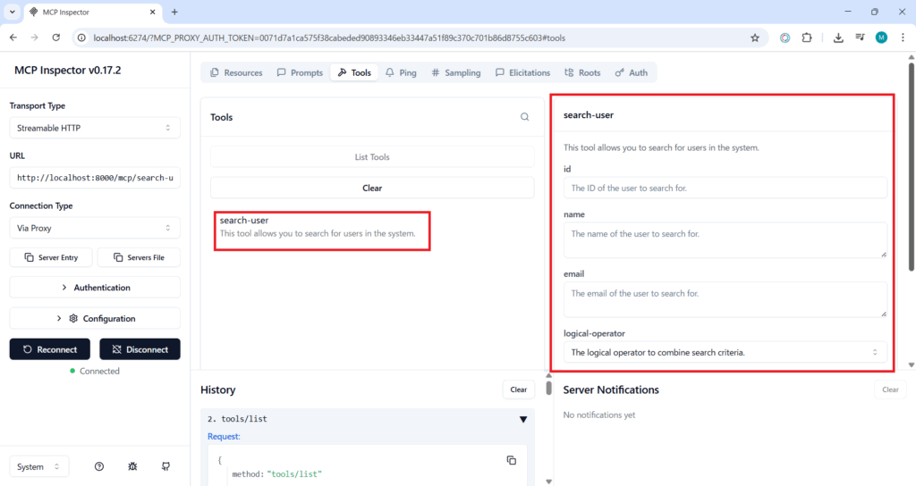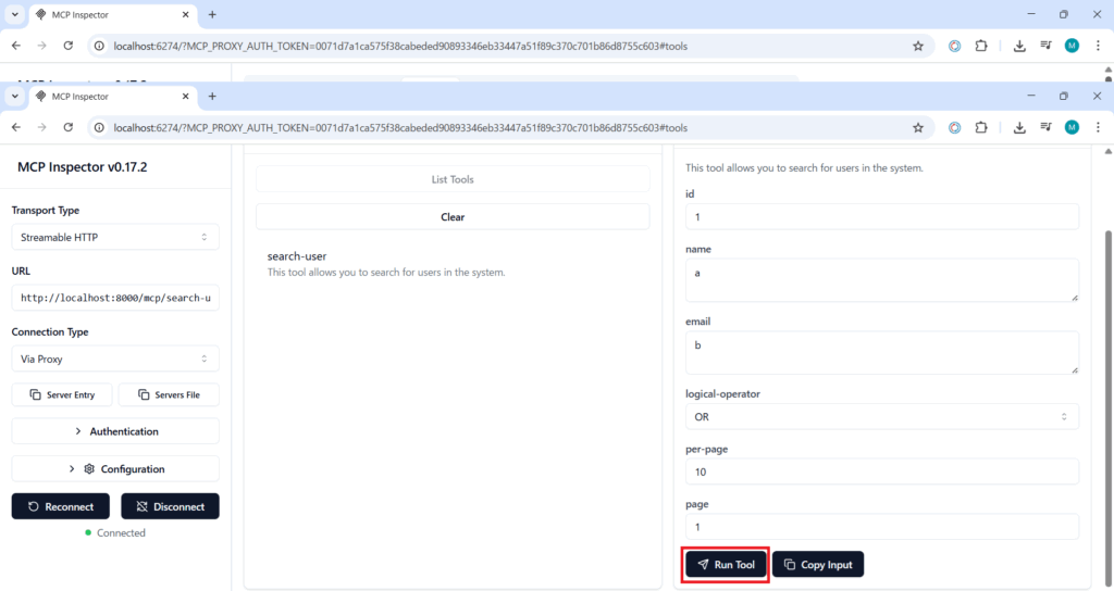 表示されたツール一覧の「search-user」をクリックすると、右側にパラメータの入力フォームが表示されます。