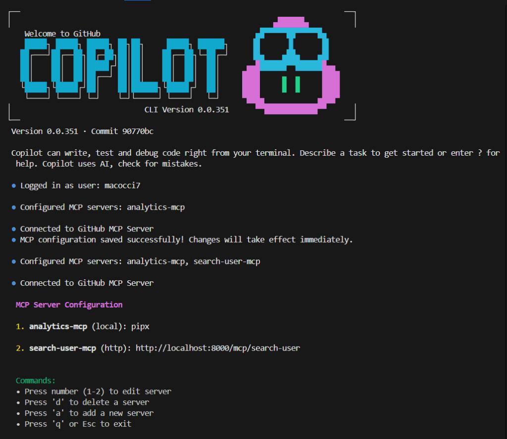 設定完了するとMCPサーバーのリストに表示されるので、[q]を押下して設定を終了します。