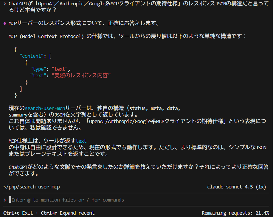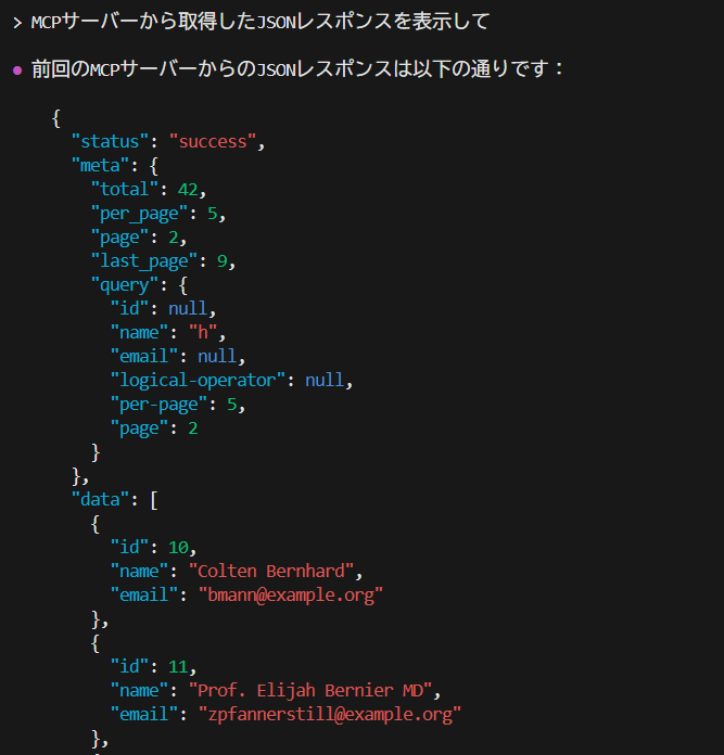 以下のような構造が最も実用的で、OpenAI/Anthropic/Google系MCPクライアントの期待仕様にも整合します:{ "status": "success", "meta": { "total": 123, "page": 1, "per_page": 10, "query": "keyword=apple" }, "data": [ { "id": 1, "name": "Apple Inc.", "category": "Technology", "founded": 1976, "country": "USA" }, { "id": 2, "name": "Apple Japan G.K.", "category": "Subsidiary", "founded": 2003, "country": "Japan" } ], "summary": "Found 123 companies matching 'apple'. Showing first 10 results." }